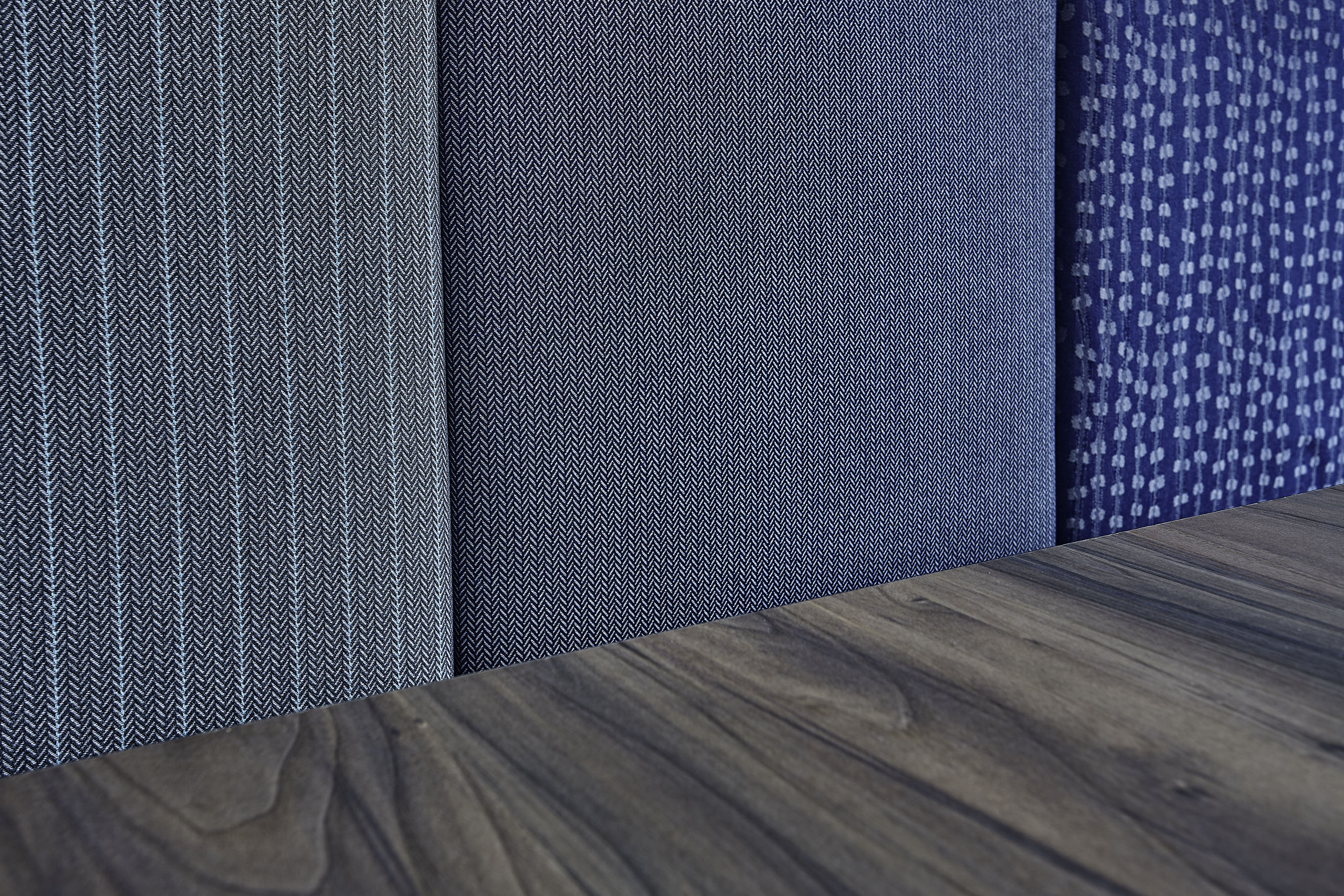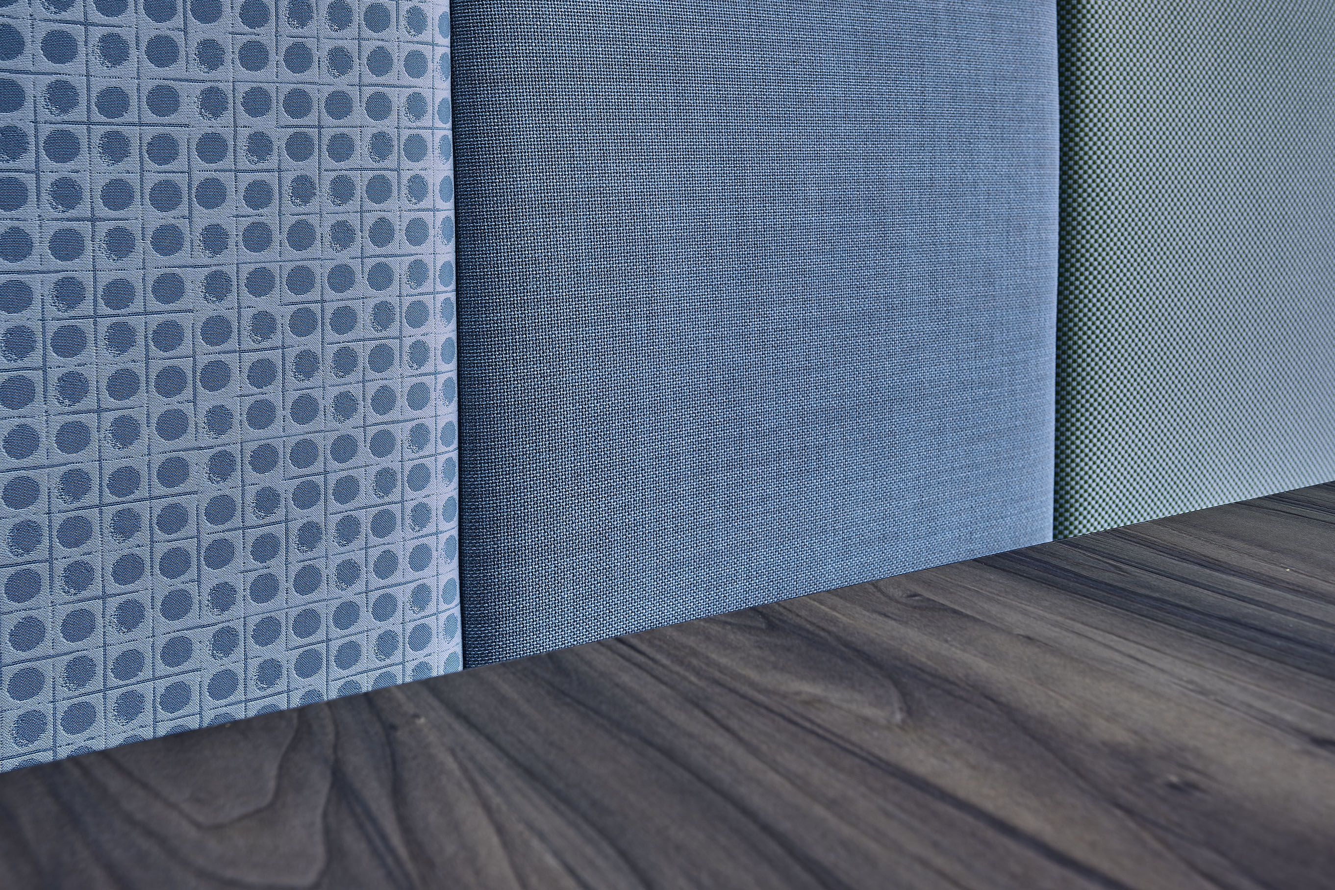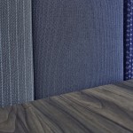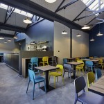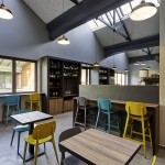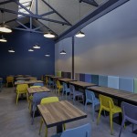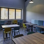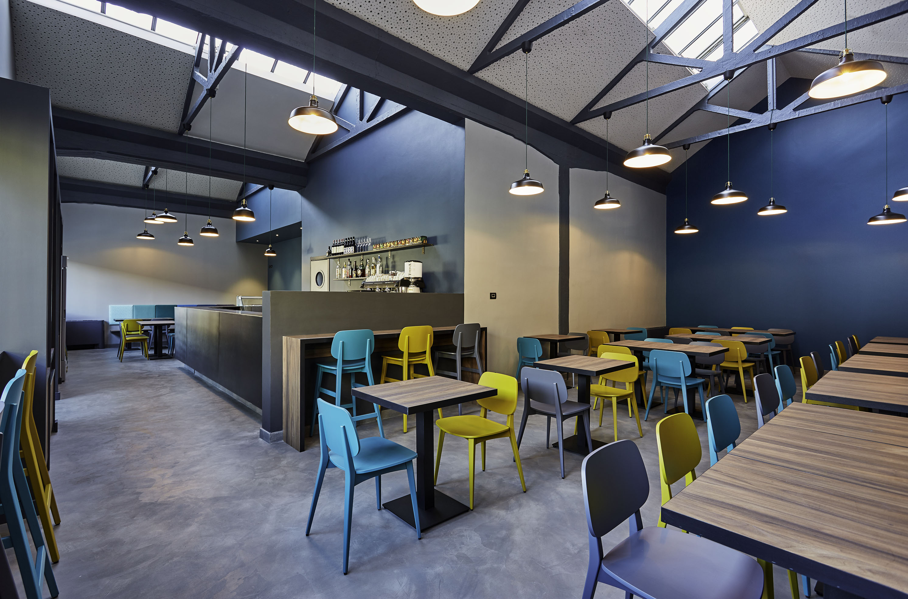 Il pavimento in cemento, il bancone in ferro grezzo, il legno di tavoli e le sedute rimandano al mondo dei materiali industriali. La gamma cromatica dei verdi-blu mettono in evidenza le capriate del tetto, i pilastri in cemento e i fondali murari. Le sedie e gli sgabelli in 3 varianti cromatiche; gli schienali imbottiti delle sedute lineari sono rivestite con una selezione di tessuti creati da Maria Flora per in ed outdoor.