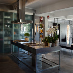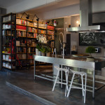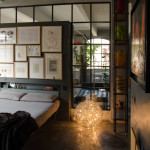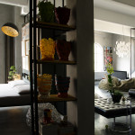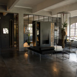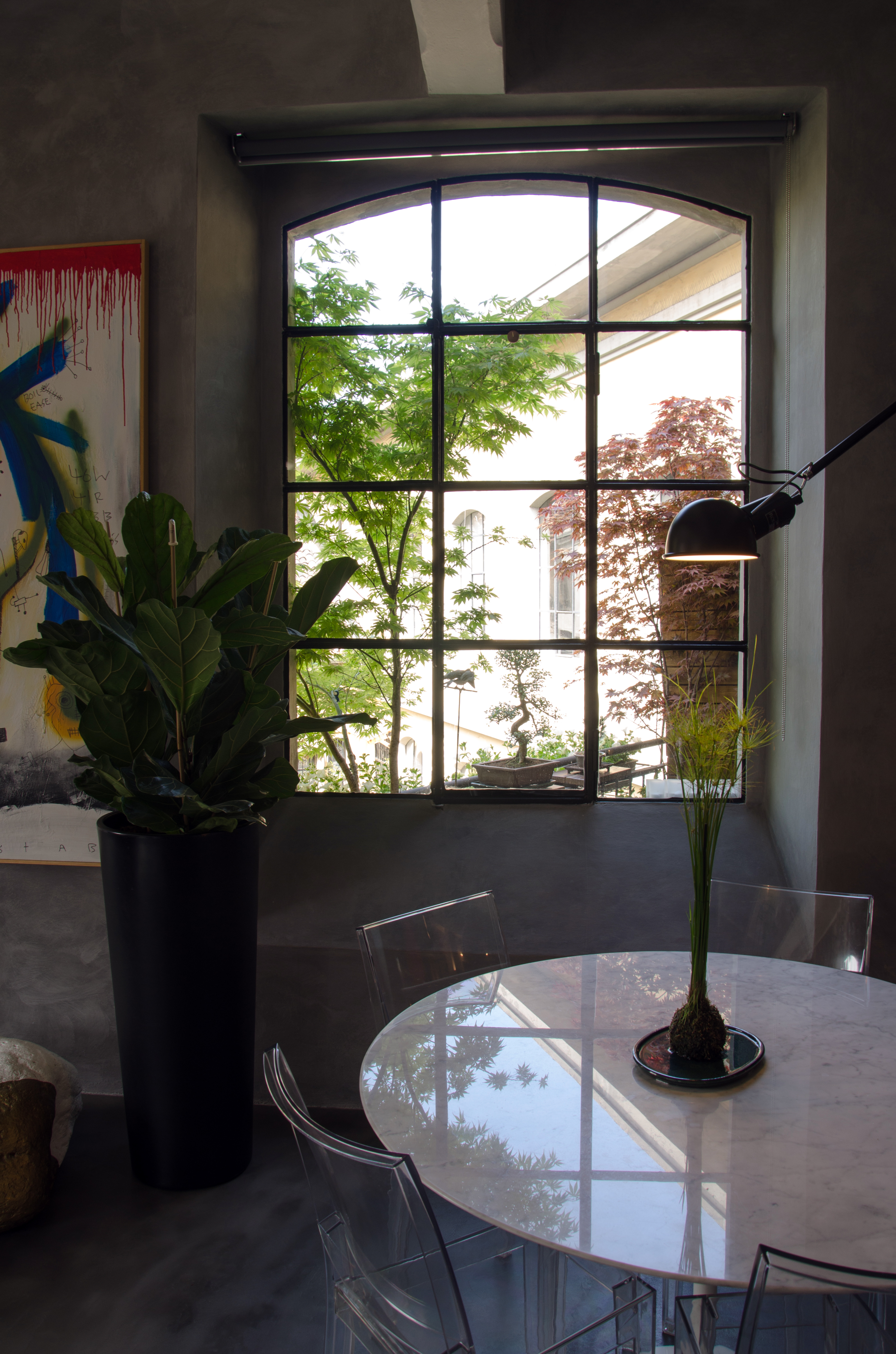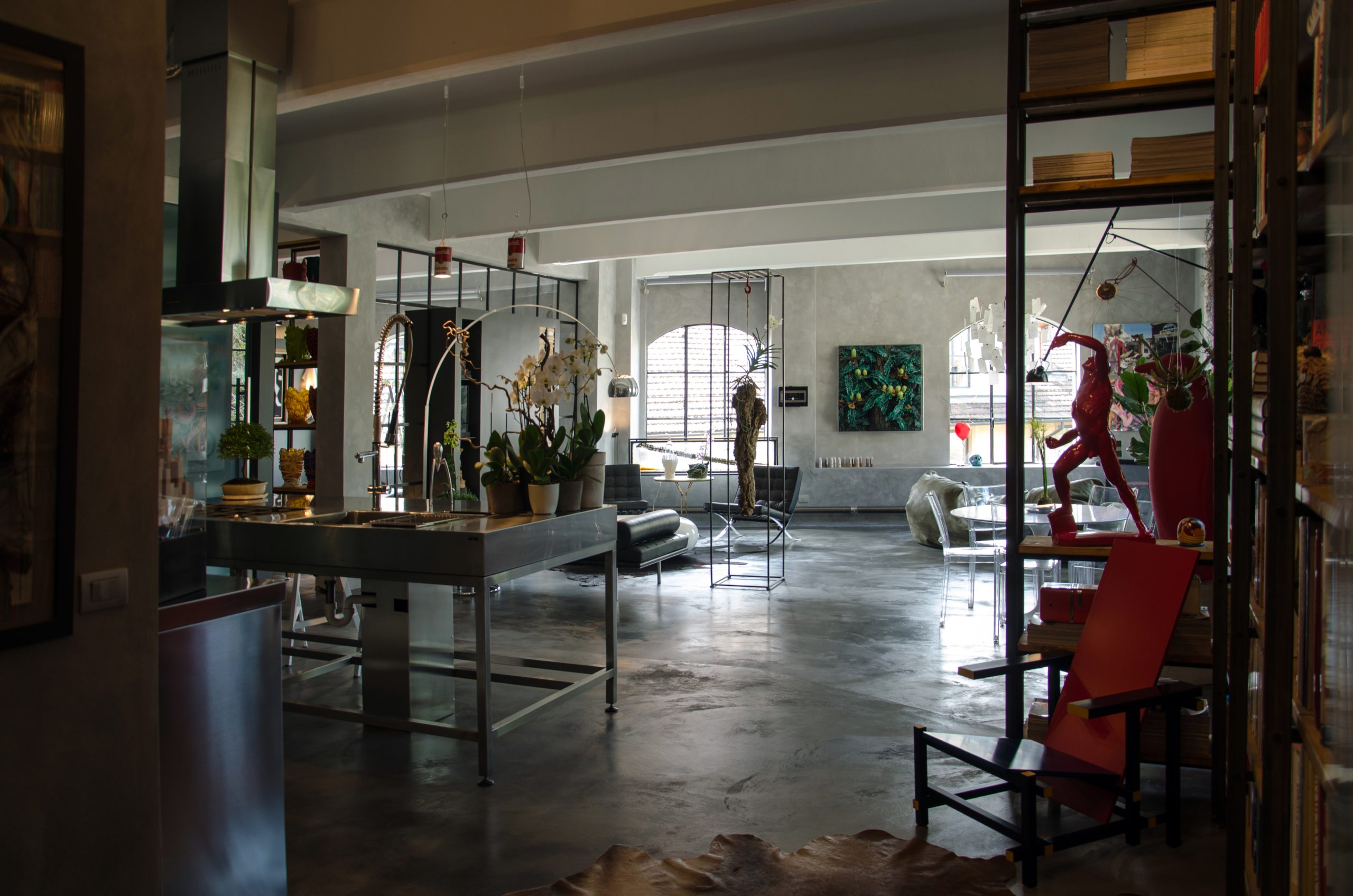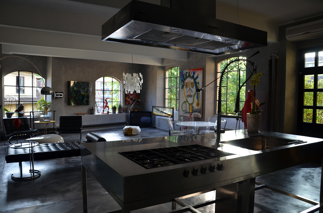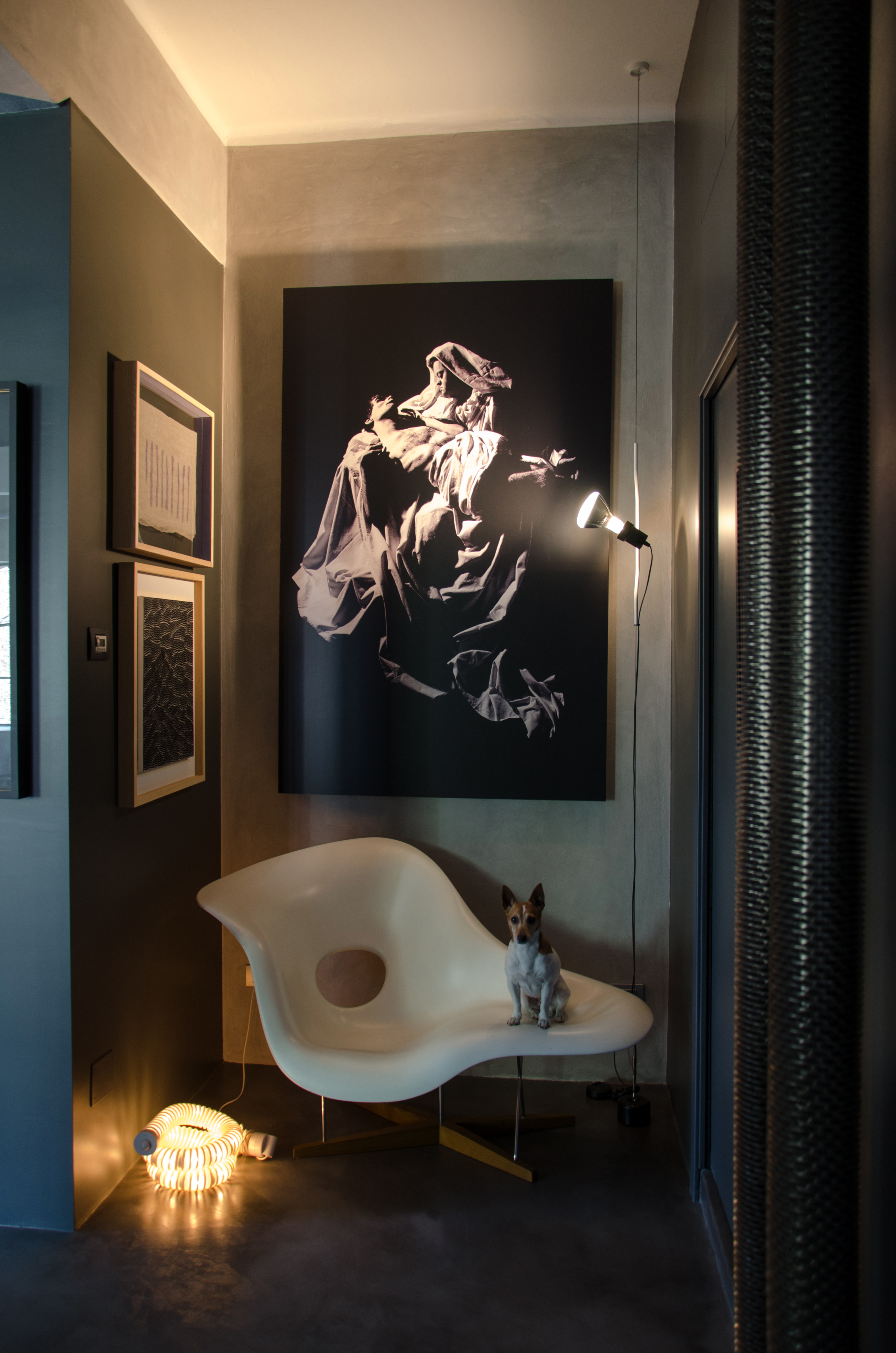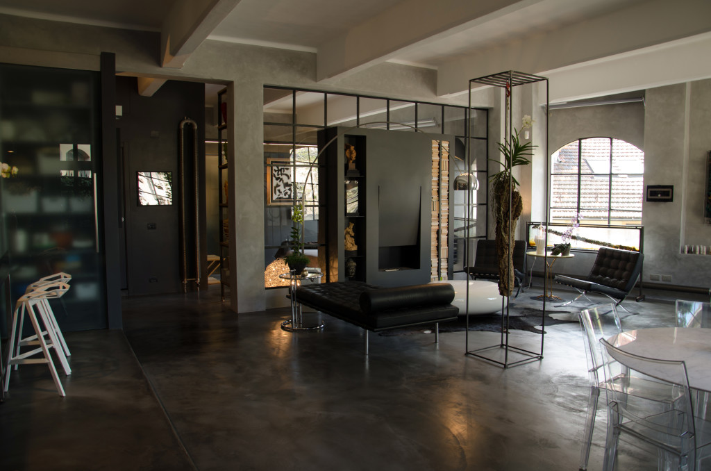 Sia le fasi di progetto che di realizzazione sono state un confronto continuo con i clienti e con le loro dettagliate richieste, tanto da poter definire questo lavoro come un lavoro a più mani. L’intento progettuale non è stato quello di stravolgere lo spazio, già ben configurato, ma di agire puntualmente su alcune sue parti. In particolare si decide di demolire l’unico muro che separa il living dalla camera matrimoniale con l’intento di ricostituire la percezione di un unico grande spazio. Per questo, al posto del muro divisorio, i clienti decidono di inserire un volume che sul lato del soggiorno alloggia un camino a bioetanolo (Canto del fuoco di Antonio Lupi), mentre dal lato della camera funziona come testiera del letto. A incorniciare questo volume è stata inserita una grande vetrata con profili in ferro che richiama il disegno delle finestre industriali esistenti. In questo modo si è salvaguardata la privacy della camera da letto, pur ripristinando la percezione dello spazio unico e aperto. Un altro importante intervento riguarda il pavimento esistente, in resina, che si presentava danneggiato in molte parti e per questo i clienti hanno deciso di sostituirla con un “Cemento naturale” con cui abbiamo rivestito anche tutte le finiture del bagno. All’interno del loft, a sottolineare l’impronta post-industriale dell’intero edificio, dominano le tonalità dei grigi e gli elementi in ferro grezzo. La stessa impronta è presente anche in molti dettagli d’arredo disegnati e realizzati su misura e su disegno dei clienti, dal grande pouf in pelle alla libreria in ingresso. Per il resto la casa è una vera galleria di design, uno spazio pensato proprio per contenere gli oggetti e le opere che i due proprietari collezionano con passione da tempo.