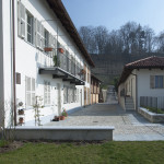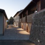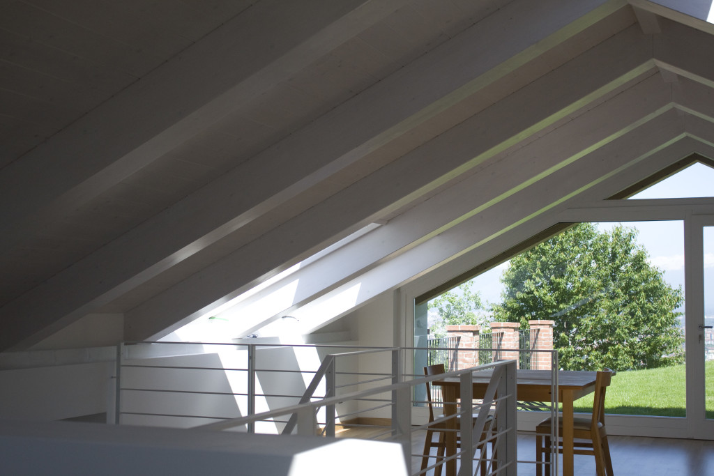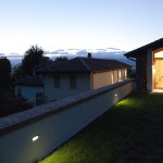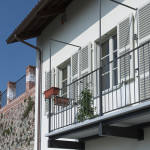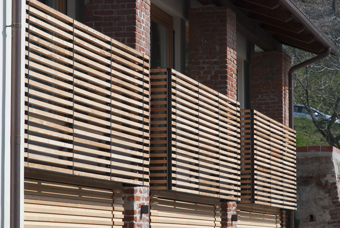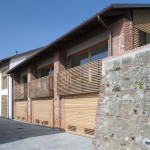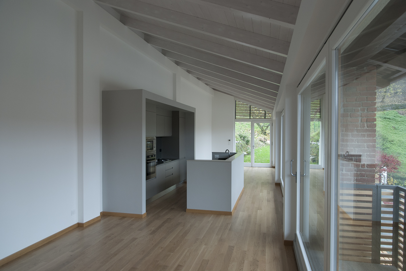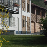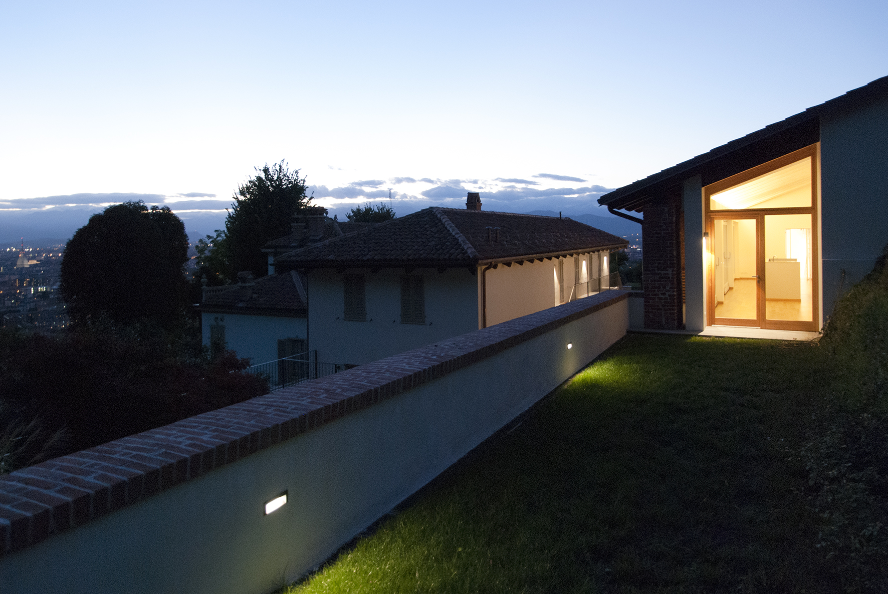 Si tratta di due edifici distinti, addossati al pendio, nei quali sono stati ricavati tre appartamenti. Ogni appartamento si affaccia sul cortile comune e su una parte di giardino privato. Sull’edificio a monte, costruito negli anni Quaranta a destinazione agricola, si interviene in maniera più radicale. Sono stati demoliti solai e copertura. Si mantiene solo la facciata originaria. All’interno di questa “scatola” è stata costruita una struttura completamente nuova, su due piani più il piano sottotetto, reso ora abitabile. I prospetti laterali sono stati “svuotati” per realizzare un’unica vetrata e godere del panorama sulla città e sulle montagne da una parte e sul verde dall’altra. La facciata est è stata poi schermata con un sistema apribile di frangisole a listelli di legno. Lo stesso sistema è stato adottato su parte della facciata principale, in corrispondenza dell’ex granaio. Sull’edificio a valle invece s’interviene in maniera più conservativa, eliminando le piccole aggiunte degli anni Quaranta. Anch’esso addossato al pendio, è coevo alla villa settecentesca sottostante, appartenente a un’altra proprietà.