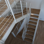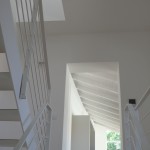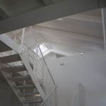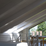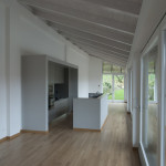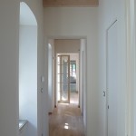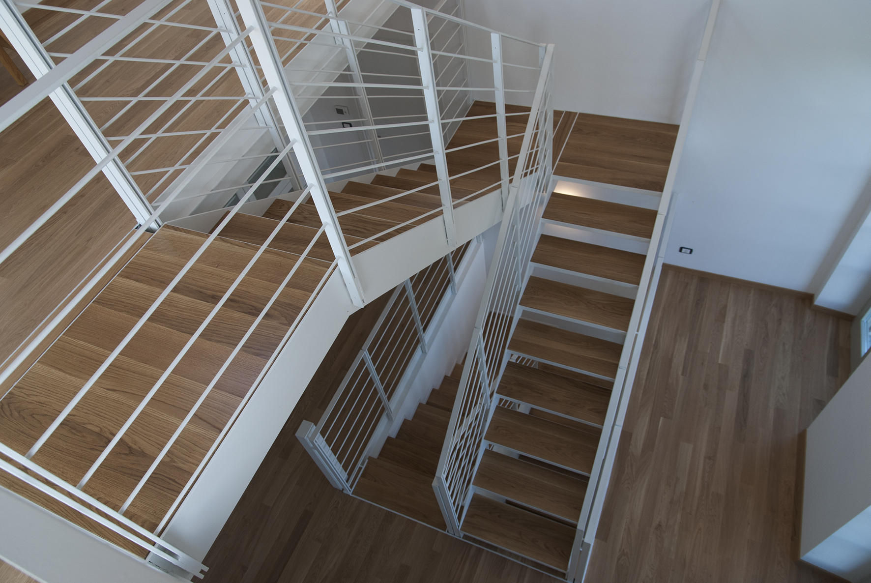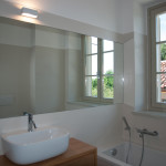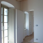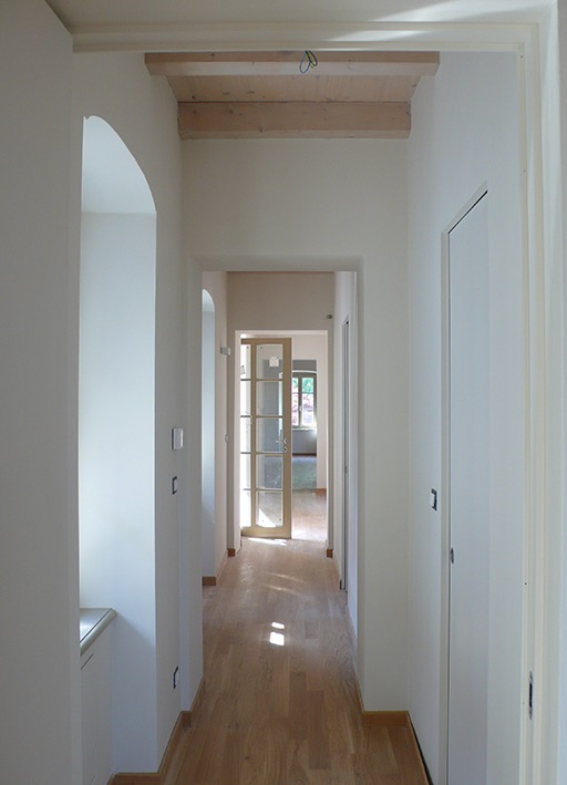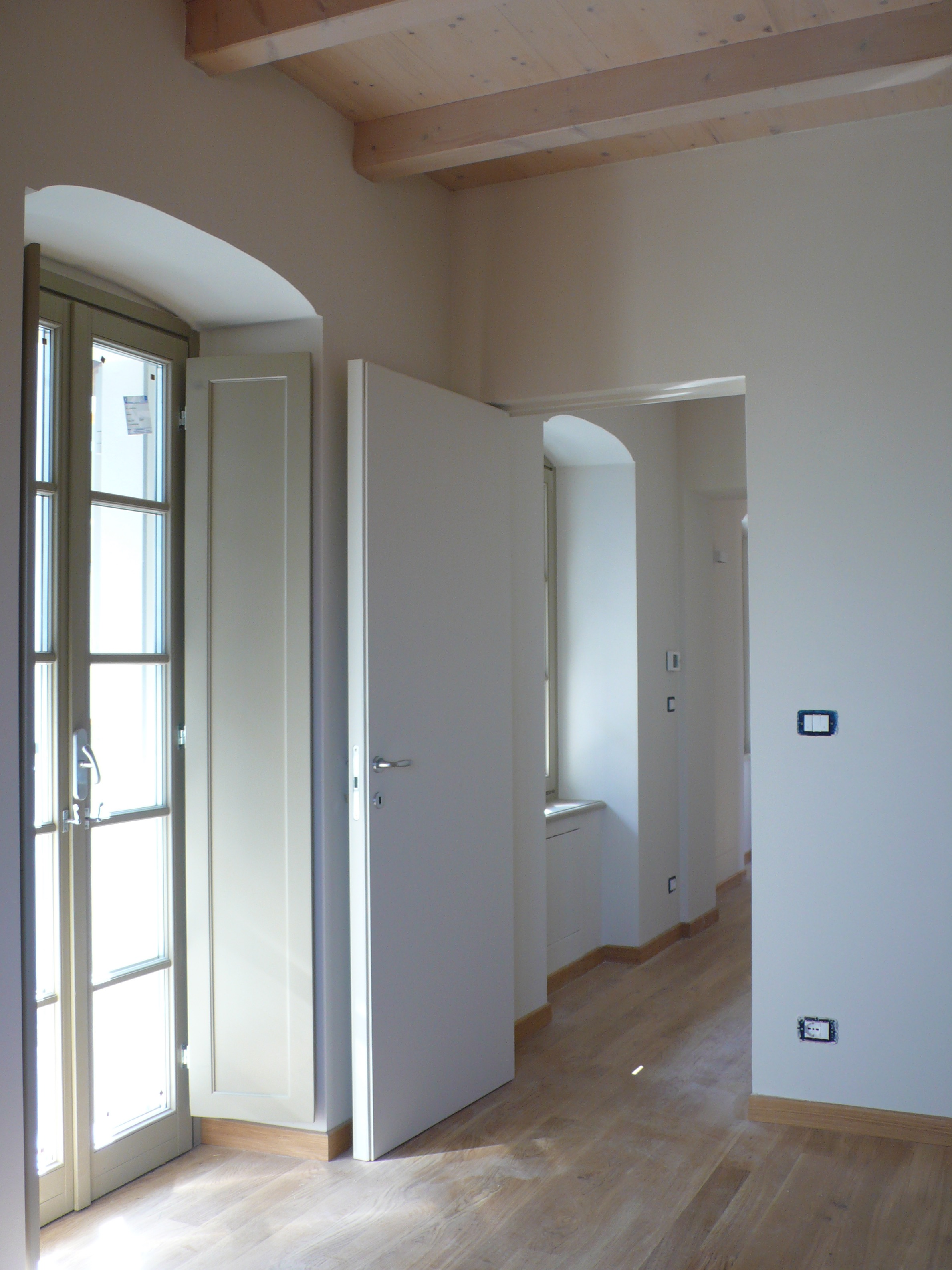 Per gli interni si segue lo stesso approccio sui due edifici: più contemporaneo per quanto riguarda l’edificio a monte e più conservativo per l’edificio a valle. I pavimenti sono in rovere tinta naturale, pareti e materiali di rivestimento hanno toni neutri, i soffitti in legno e le scale in ferro sono bianco latte. La scelta dei colori è dettata anche dal fatto che, essendo gli appartamenti destinati all’affitto, sembrava più opportuno scegliere una palette di colori neutri che i futuri utenti potessero eventualmente completare secondo il loro gusto. Sulla stessa linea sono stati studiati gli arredi fissi disegnati su misura, le cucine e le luci. I serramenti esterni sono in legno, laccato nel caso delle aperture tradizionali, in larice nel caso delle aperture più grandi. E’ stato scelto questo materiale per soddisfare l’esigenza della committenza di non avere grossi problemi di manutenzione. Questo legno, infatti, non ha bisogno di protezione superficiale e ingrigisce nel tempo, integrandosi nel paesaggio.