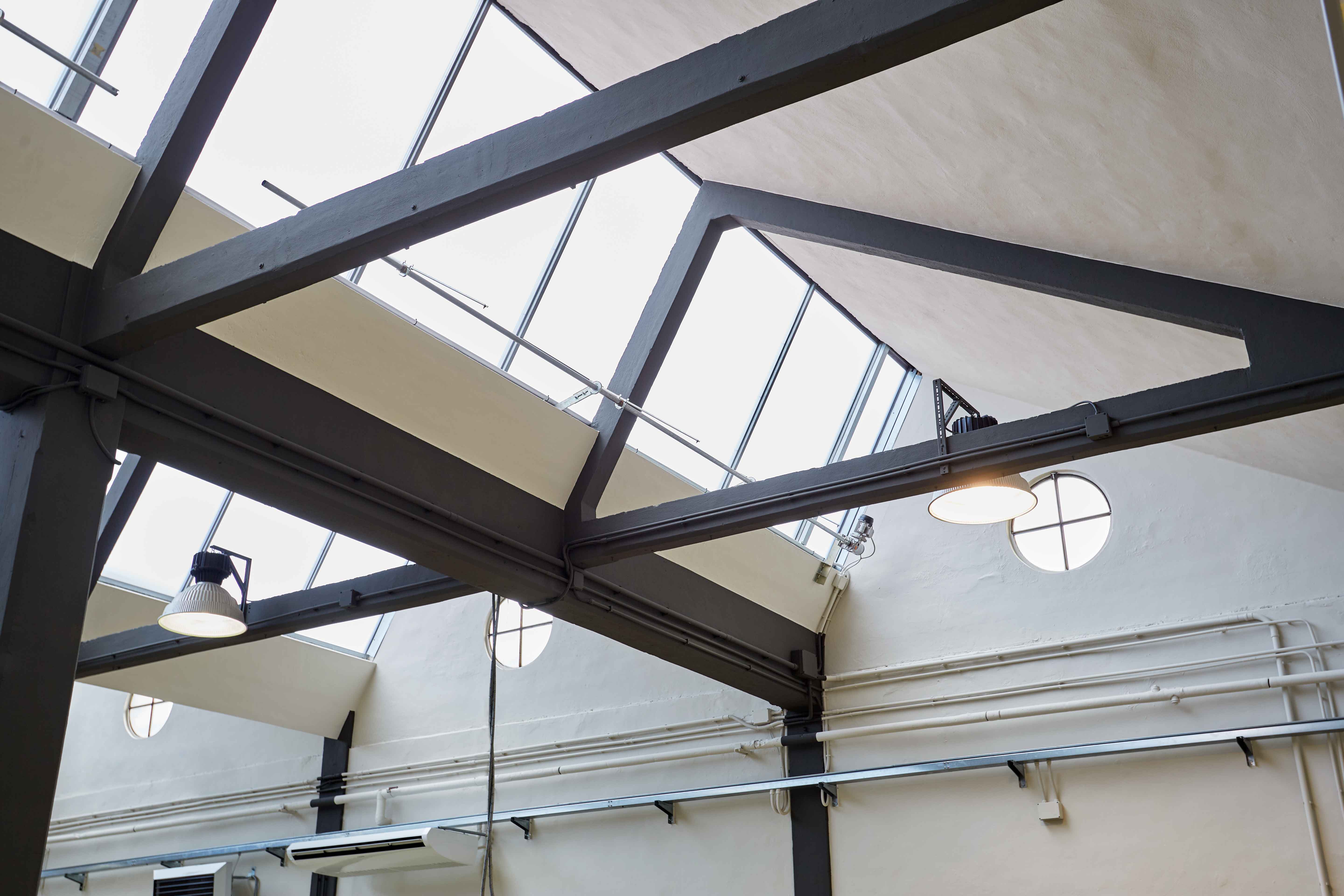 Colori solari si alternano ai toni grigio-ferro che mettono in evidenza le capriate del tetto e i pilastri in cemento della struttura industriale.