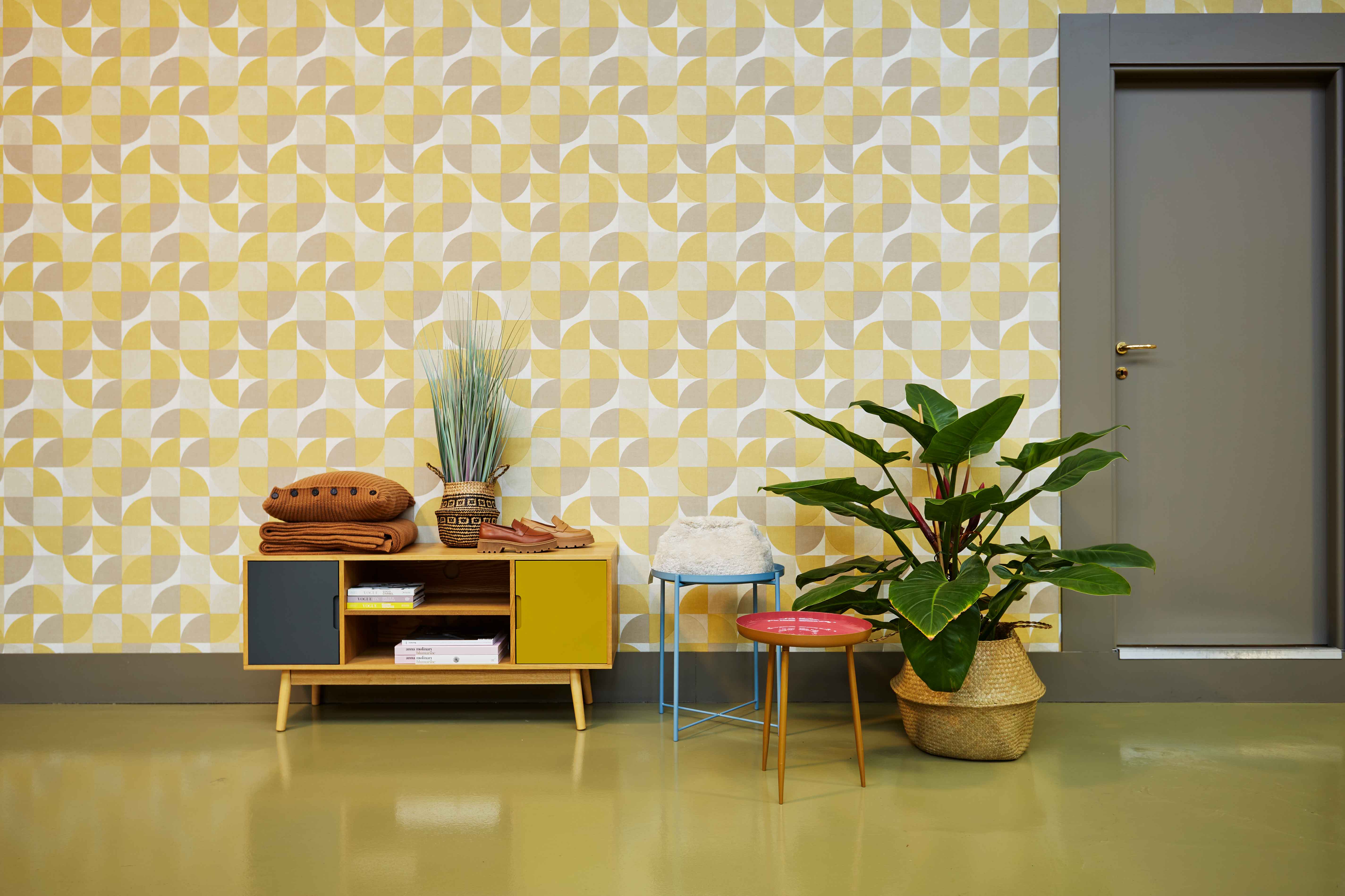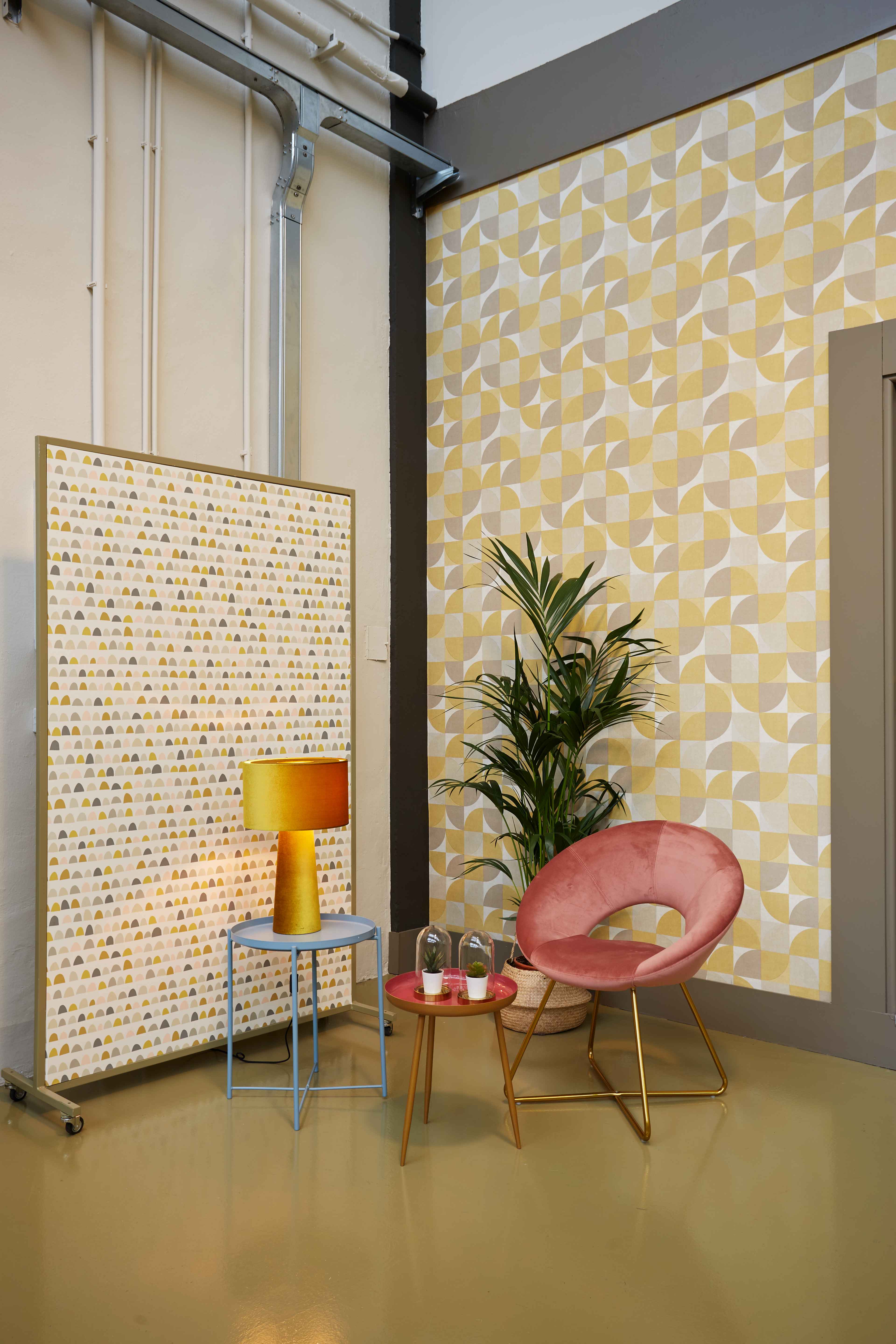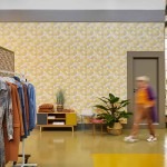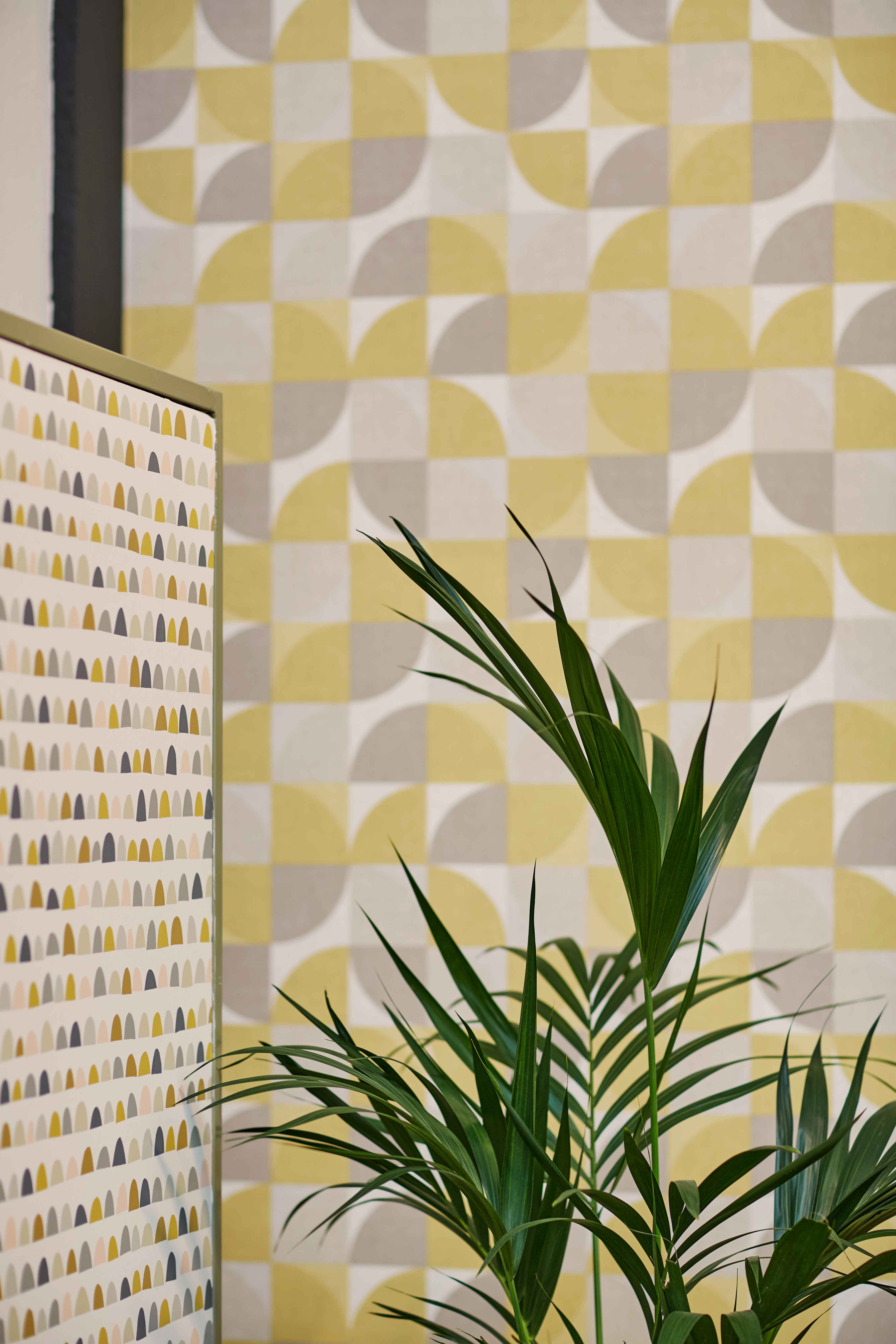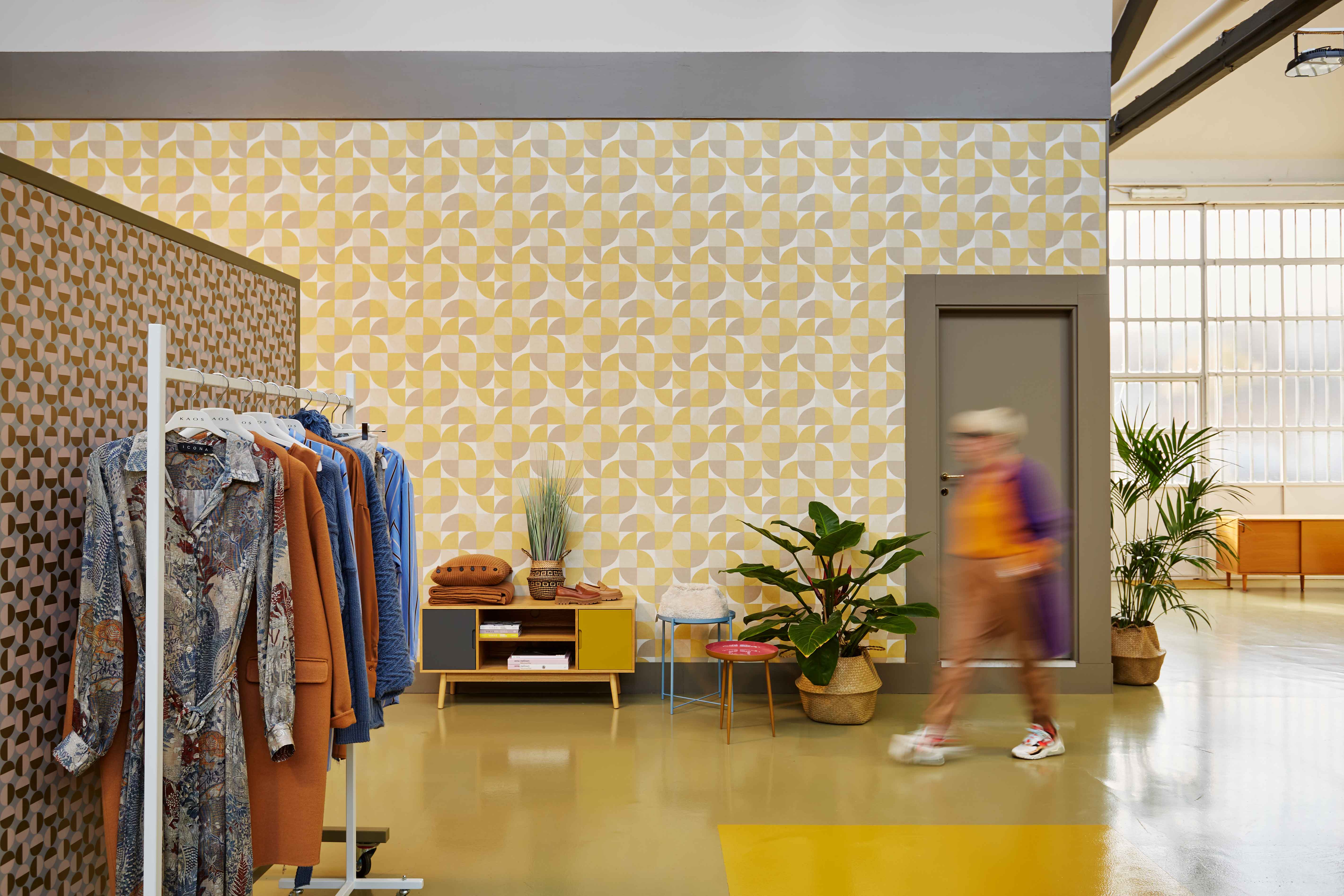 I pannelli divisori e le pareti del blocco degli uffici amministrativi sono stati rivestiti con carta da parati d’ispirazione anni ’70, selezionati allo scopo di poter funzionare anche abbinati.